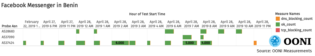 **Figure 3:**Facebook Messenger testing in Benin, Open Observatory of Network Interference (OONI) measurements, Benin: https://explorer.ooni.io/country/BJ