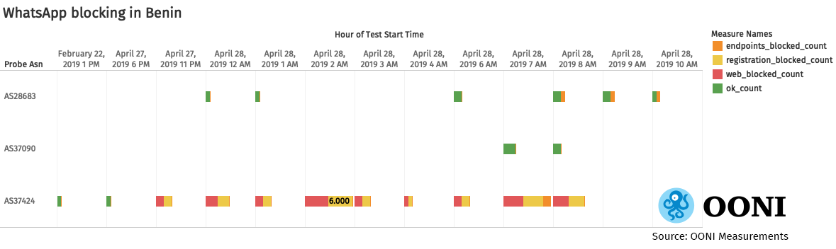 **Figure 2:**WhatsApp blocking in Benin, Open Observatory of Network Interference (OONI) measurements, Benin: https://explorer.ooni.io/country/BJ