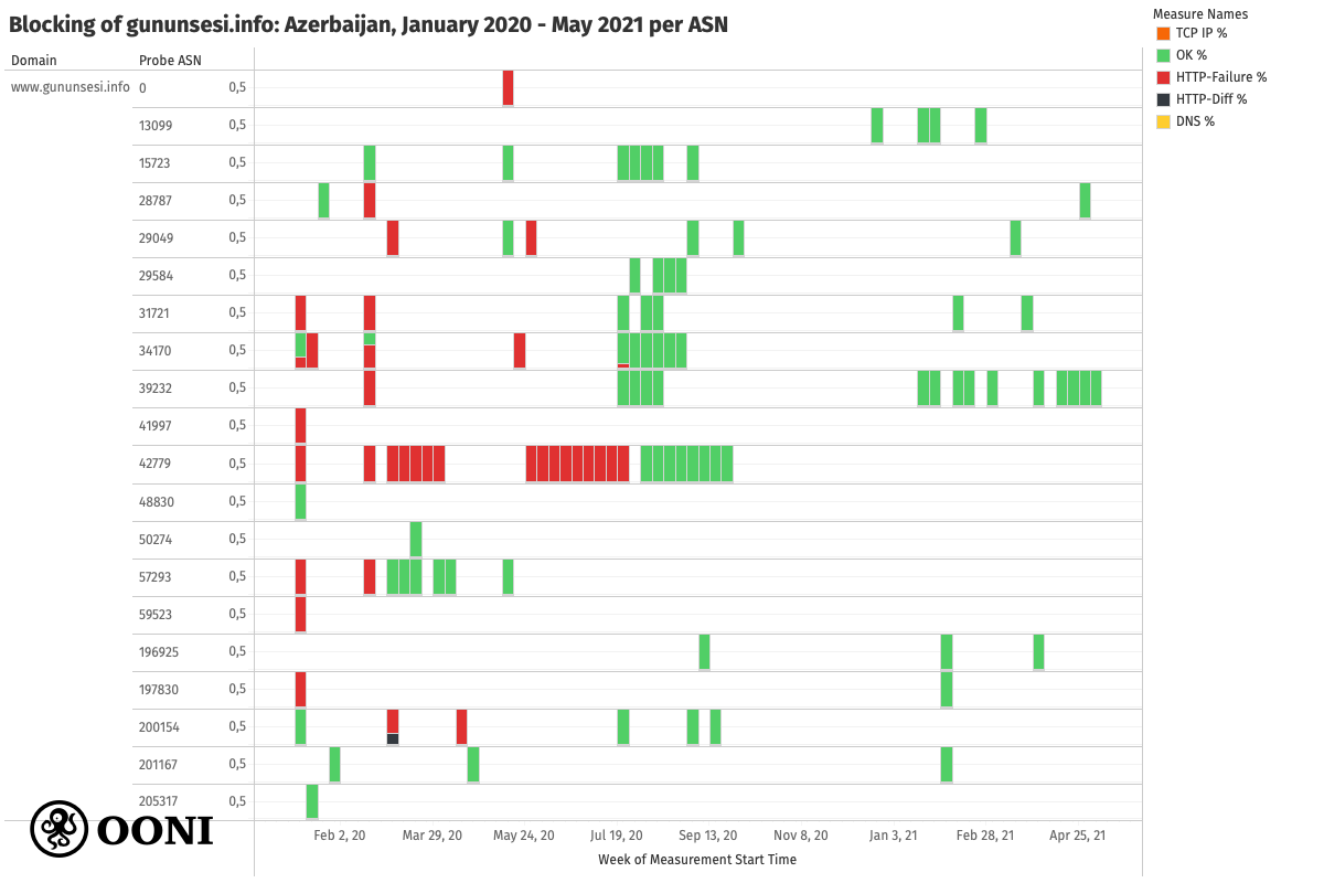 The above chart aggregates measurement findings (per domain) from many different networks in Azerbaijan (as annotated in the chart, where the largest dots correspond to measurements collected from 9 local networks). The reason why we see different measurement results (such as “OK” and “HTTP failure”) for the same URL on the same dates is because those results were collected from different networks. This therefore suggests that media website blocking varies from network to network in Azerbaijan. This is further evident through a per ASN analysis of measurements.