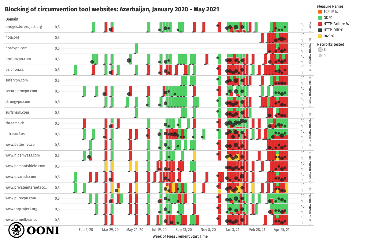 As OONI Probe only includes tests for 3 circumvention tools (Tor, Psiphon, RiseupVPN), it remains unclear if the apps of all the other aforementioned circumvention tool websites were blocked as well (i.e. it is possible that only their websites were blocked). RiseupVPN measurements are excluded from this analysis (since this test was only released a few months ago), but recent measurements collected from Azerbaijan suggest that RiseupVPN works on local networks.