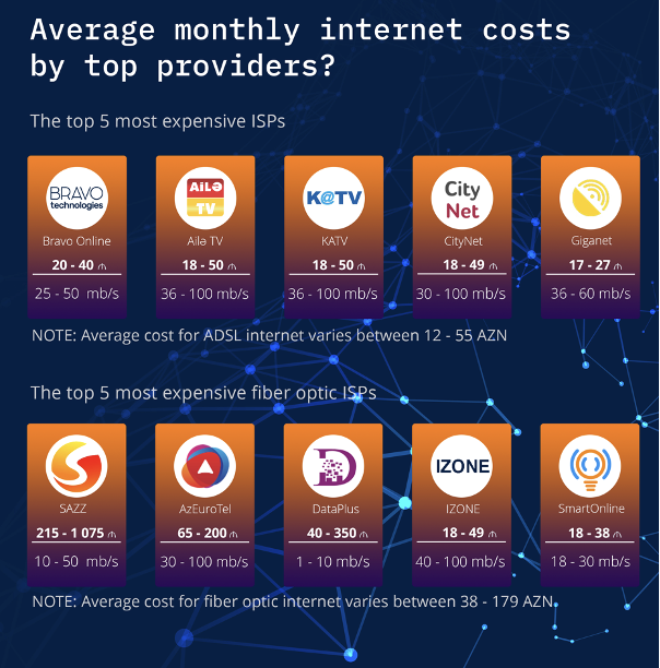 The cost of the internet packages offered by ISPs ranges between 15AZN (10.5 USD) and 80 AZN (47 USD) per month. In comparison, the average monthly salary in Azerbaijan is estimated by independent experts to be about 340 AZN (200 USD), making the costs of internet access is prohibitively expensive for many in the country (see Infographic 2).