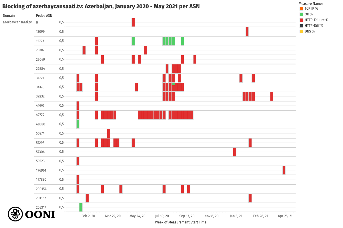 Press freedom appears to be quite limited in Azerbaijan, as suggested by the blocking of several independent news media websites in the country. These media websites presented signs of blocking throughout their testing (on several local AS networks) between January 2020 to May 2021 (corroborating past reports on the blocking of media websites in Azerbaijan), with recent OONI measurements suggesting that their blocking remains ongoing.