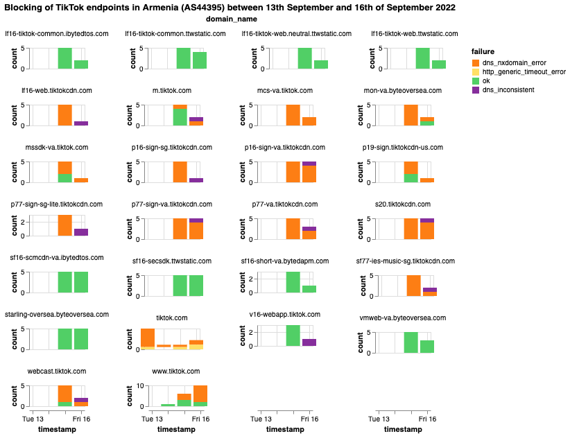 The following chart shares OONI data on the testing of www.tiktok.com and tiktok.com from 5 networks in Armenia between 13th-15th September 2022.