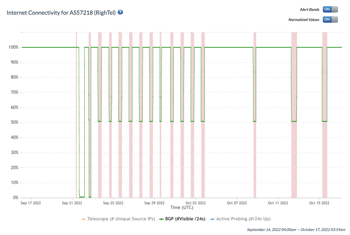 Figure 2: IODA data showing BGP signal for mobile operator RightTel between 18th September 2022 to 5th October 2022 (source: IODA). As in the previous figure, the red vertical bands indicate outages as evidenced by abnormal drops in the green BGP signal.
