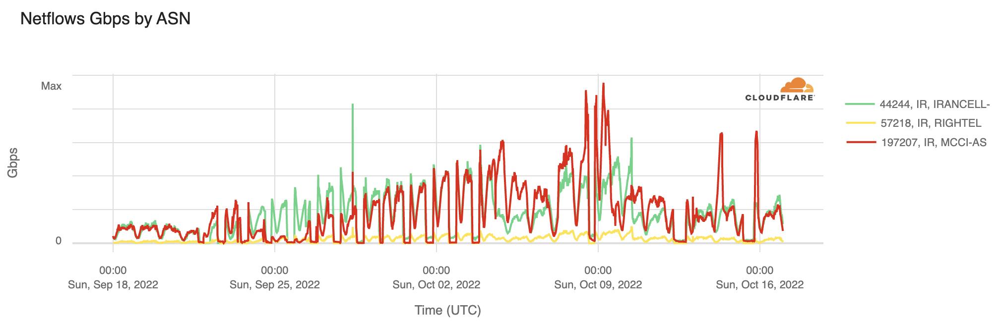 Figure 4: Graph showing Cloudflare traffic volumes for Irancell (green), Rightel (yellow), and MCCI (red) between 18th September 2022 and 16th October 2022 (source: Cloudflare Radar).