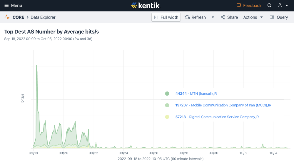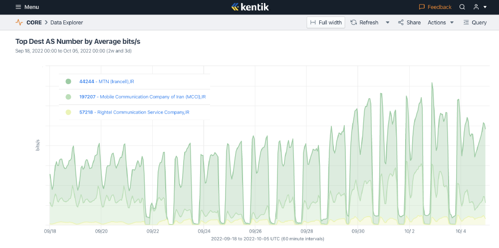 The mobile network outages are further corroborated by Kentik data (Figure 5), which shows daily drops in traffic from Irancell, MCCI, and RighTel during the same date range.