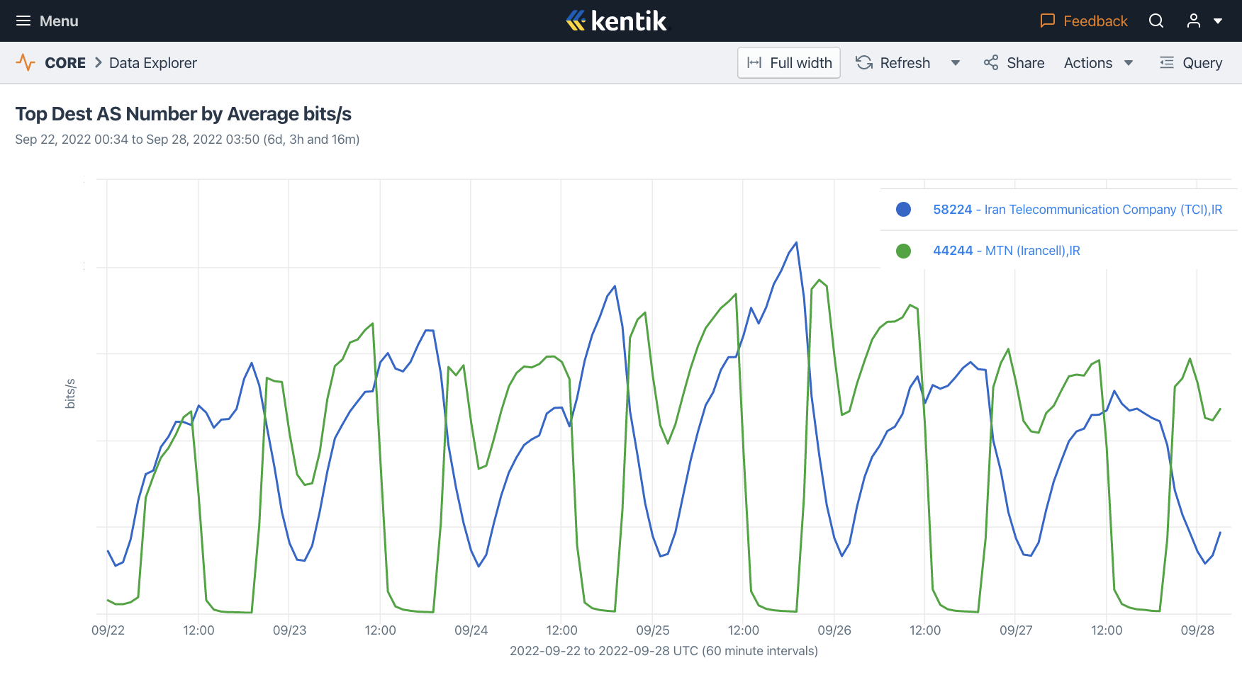 Figure 6: Graph showing Kentik traffic volumes for Iran’s largest wireline carrier (TCI, in blue) surging during shutdowns of Iran’s largest mobile carrier (Irancell, in green) between 22nd September 2022 and 28th September 2022 (source: Kentik).