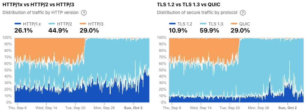 Figure 7: Cloudflare Radar graphs showing distribution of traffic by the three different HTTP versions and distribution of secure traffic by protocol for Iran (source: Cloudflare Radar).
