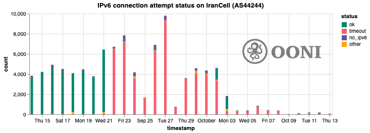 IPv6 disruption (OONI, Cloudflare)22nd Sept. to 2nd Oct.Traffic using the newer IPv6 networking protocol dropped substantially on Irancell, which could indicate the protocol was blocked.It is unclear what implications this would have for most users.