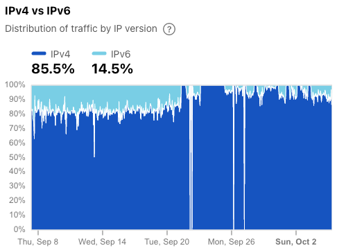 Figure 9: Cloudflare Radar graph showing distribution of traffic by IP version for Irancell (source: Cloudflare Radar).