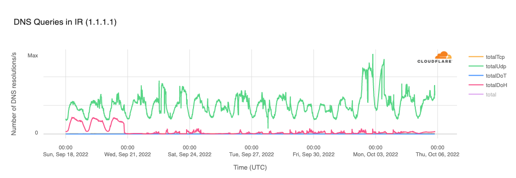 Figure 13: Traffic to Cloudflare 1.1.1.1 resolver from clients in Iran (source: Cloudflare).