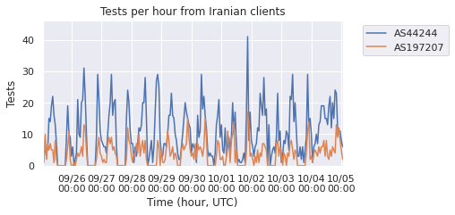 Figure 14: Number of speed tests per day since September 1, 2022 for five ISPs. Iran Telecommunication Company PJS (AS58224) is shown in orange; Irancell (AS44244) is shown in purple. (Source: M-Lab).