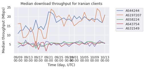Figure 16: Median daily throughput for speed tests from Iran, 2022. There is an increase in median throughput for cellular carriers Mobile Communication Company of Iran PLC (AS197207) and Irancell (AS44244). (Source: M-Lab).