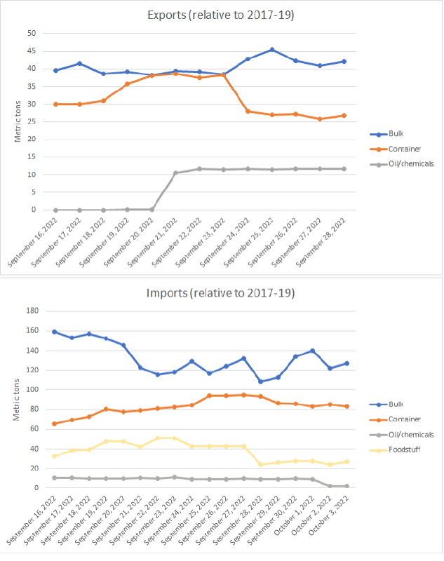Data on exports and imports by volume of goods is presented in Figure 25. Viewing just the data for September 2022 or October 2022 may provide an incomplete picture, since we need to know how much trade has changed relative to business-as-usual. To capture this, we need to look at how much trade is taking place following the shutdown relative to how much trade would normally take place during this time.