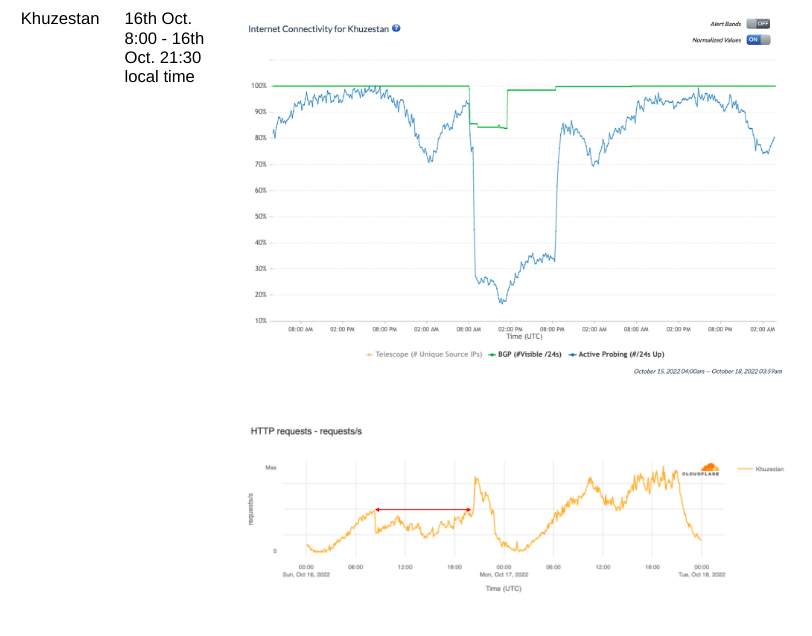 Regional Internet outages (IODA, Cloudflare)Kurdistan province: 19th Sept and 8th-9th Oct (afternoon/ evening) Khuzestan province: 16th Oct (all day)Disruptions to Internet services were observed on multiple days in September and October in Kordestan and Khuzestan. Protests following Jhina Amini’s death were particularly heavy in this province, and protest repression is always treated with far higher levels of severity in these regions dominated by Iran’s ethnic minorities (Iran’s Kurdish and Ahwazi minorities).Users on affected networks in the affected regions lost all Internet connectivity. They could access the Internet only through alternative providers. This, too, may have had a severe impact on protest documentation.