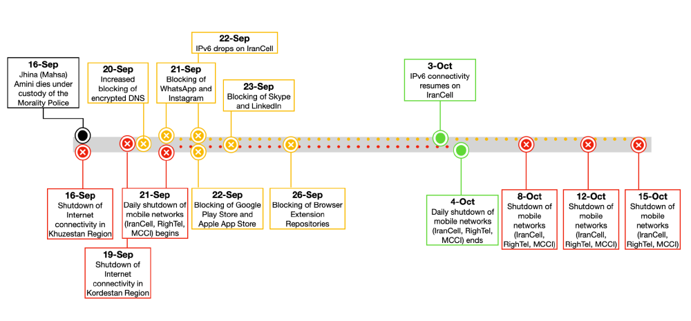 These findings are visualized through the following image, which provides a timeline of shutdown events in Iran (between 16th September and 16th October 2022) following the death of Jhina (Mahsa) Amini.