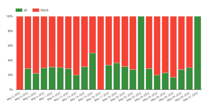 Figure: Percentage of no blocking and suspect of blocking by internet providers during the testing period.