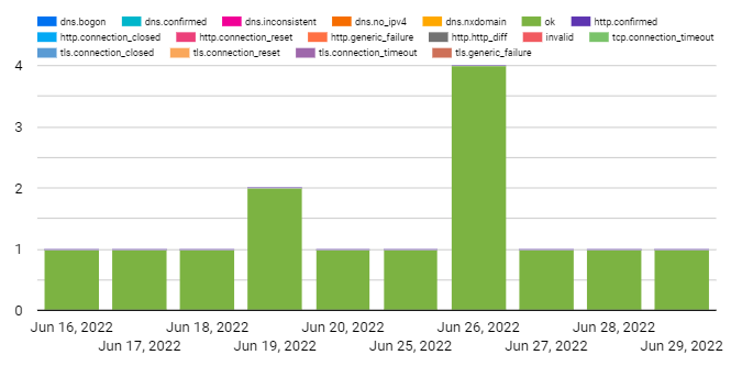 According to OONI, false positives may occur within the processed data due to a number of reasons. DNS resolvers (operated by Google or a local ISP) often provide users with IP addresses that are closest to them geographically. While this may appear to be a case of DNS tampering, it is actually done with the intention of providing users with faster access to websites. Similarly, false positives may emerge when tested websites serve different content depending on the country that the user is connecting from, or in the cases when websites return failures even though they are not tampered with.
