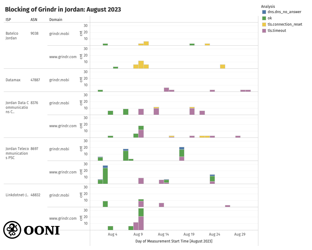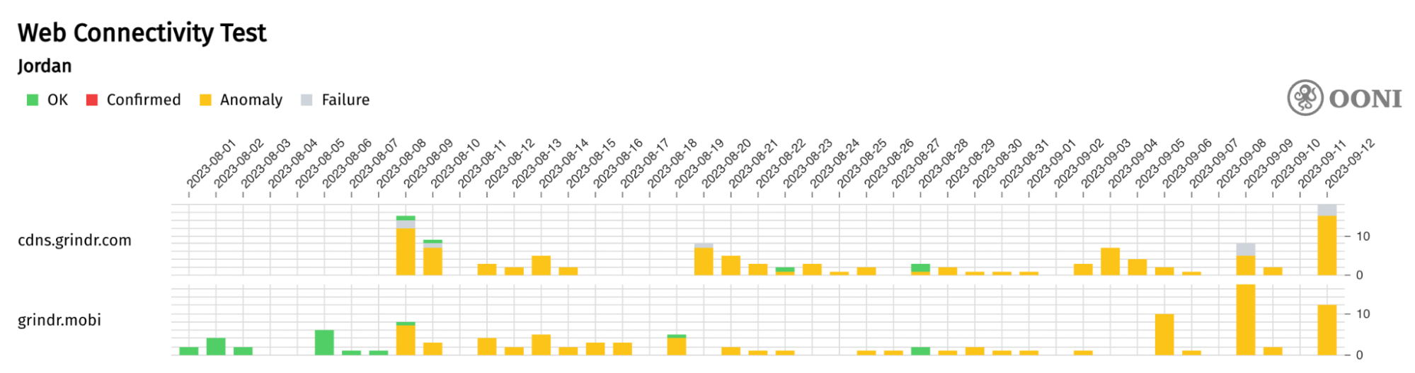 Chart: Blocking of Grindr domains (www.grindr.com and grindr.mobi) in Jordan in August 2023 (source: ooni/data tool).