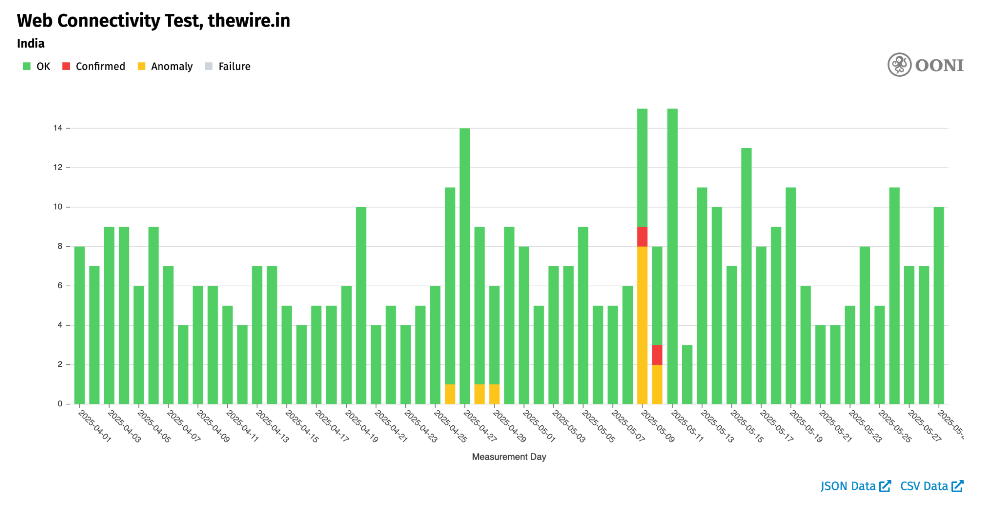 The following chart aggregates OONI measurement coverage from the testing of dailytimes.com.pk and live.samaa.tv in India between 1st April 2025 to 29th May 2025.